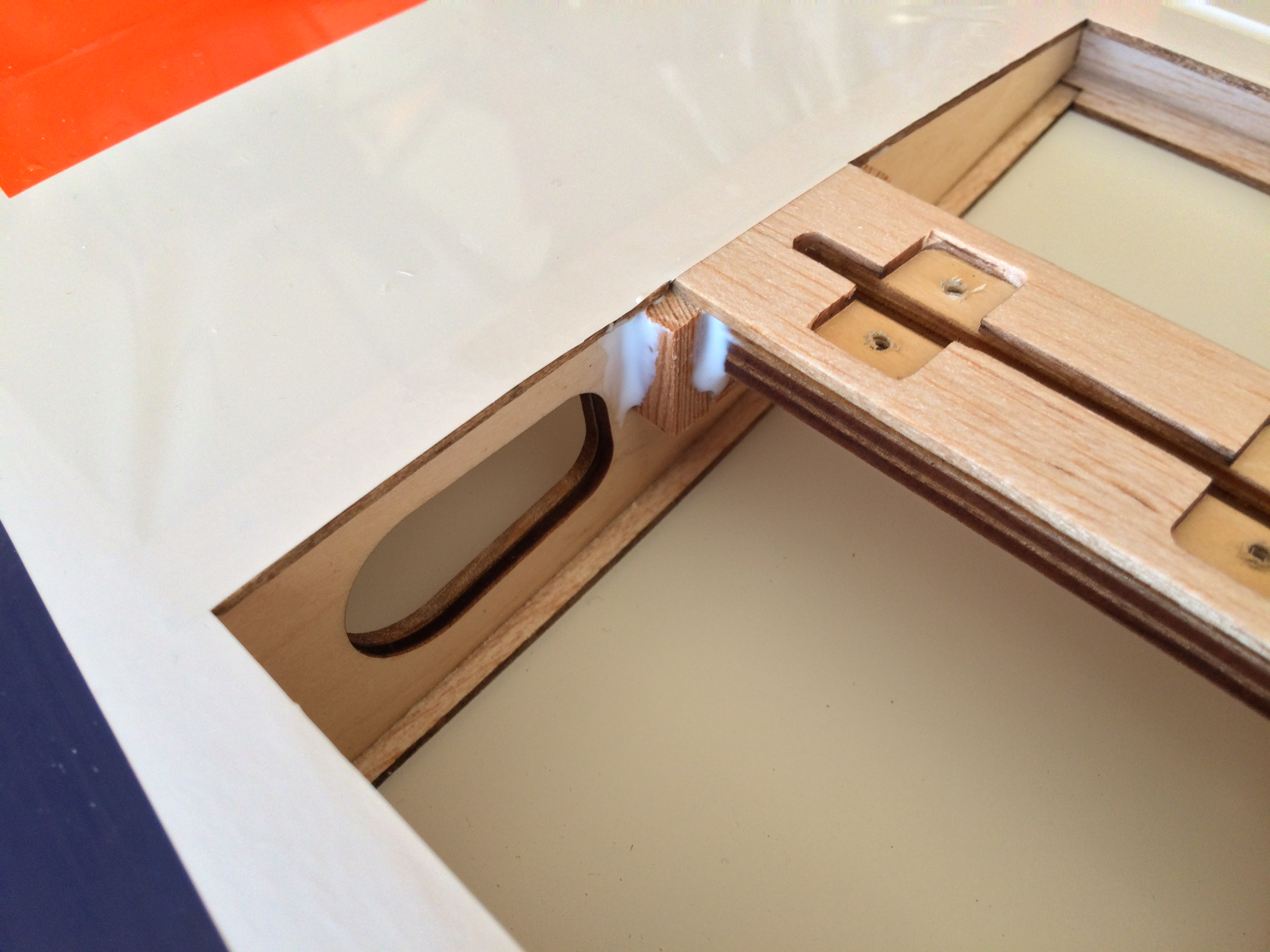 I was therefore pleasantly surprised once the covering was peeled back. The blocks are held in place between two plywood doublers and appear to ‘slot’ into holes cut in the rib, effectively sandwiched then into place during building. Loose fit or not that block is not going to come out short of splintering the entire rib. So why had mine come loose in the slots? Jokes about my landings aside, my guess is that cyanoacrylate has been used. Even when thick, cyano is not the best glue to use for a component that receives any kind of shock – it is too brittle. I have beefed up my blocks by affixing a hardwood strip ‘cradle’ to surround the joint and used a liberal quantity of white wood glue. Fingers crossed this should now hold up to landings on a grass field.