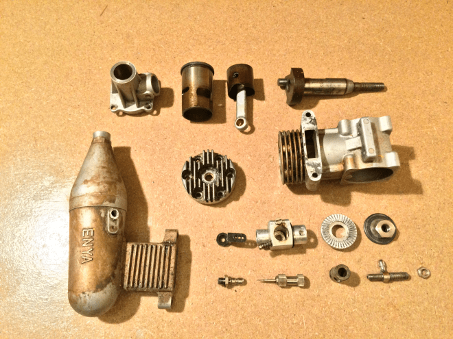 Example 1: Here we see the components of a very dirty second-hand Enya SS40 laid out following removal of the cylinder liner in the oven. I leave the conrod attached to the piston when cleaning my engines. This particular engine uses a plain bronze bushing so there are no ball bearings to contend with, but where present now is a good time to check if they need replacing. Most engines use a sealed front and an unsealed rear. A set of new bearings will cost around £5 from a bearing specialist like RCbearings. Alternatively try a cycle shop.