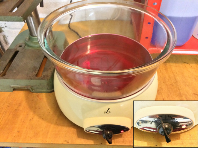 I use either Halfords red concentrate or Prestones antifreeze/coolant concentrate but anything will do the job providing – and this is important – it has corrosion inhibitors. This will ensure the aluminium anodising will not be harmed. If you have any concerns about food contamination, particularly if using a ceramic type, then I would urge on the side of caution and mark the cooker for hobby use only. A suitable slow cooker can be bought for less than £20 new from the likes of Argos so this need not be a particularly expensive sacrifice.