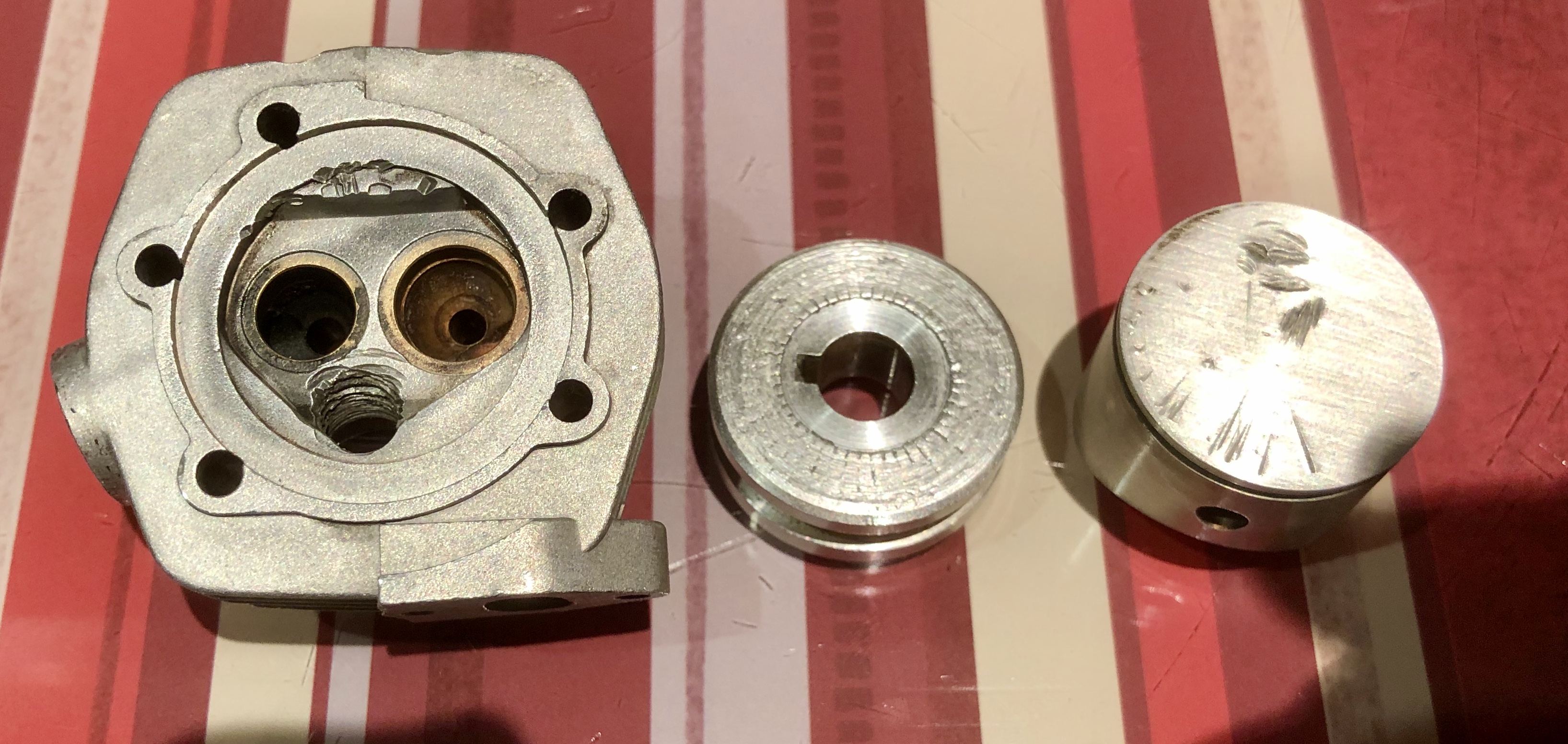 Curious damage to glow threads, combustion chamber, prop driver and piston. Yet those valves seats were fine and the marks on the pistion didn’t line up with the poppets. Was the damage terminal though?