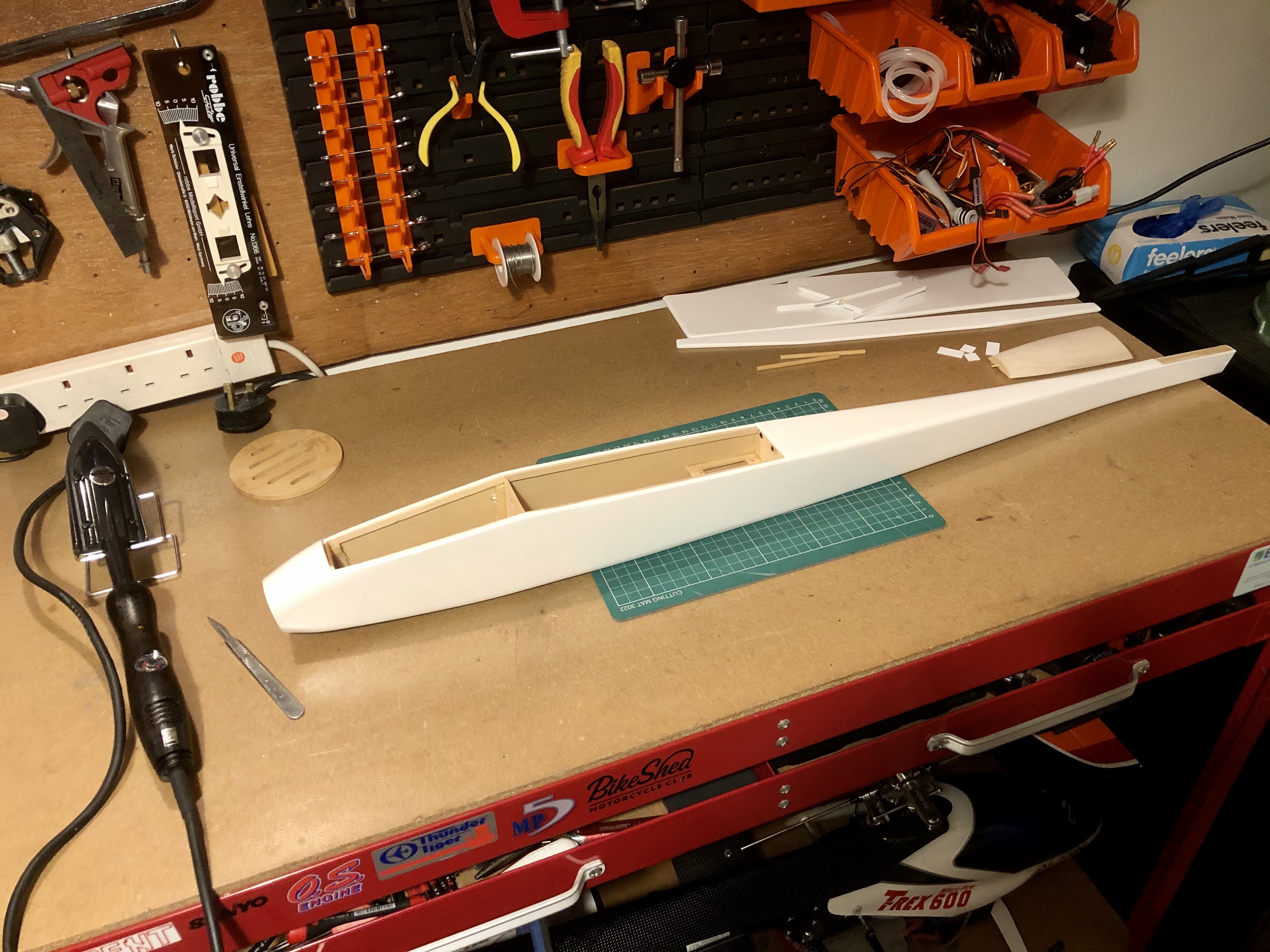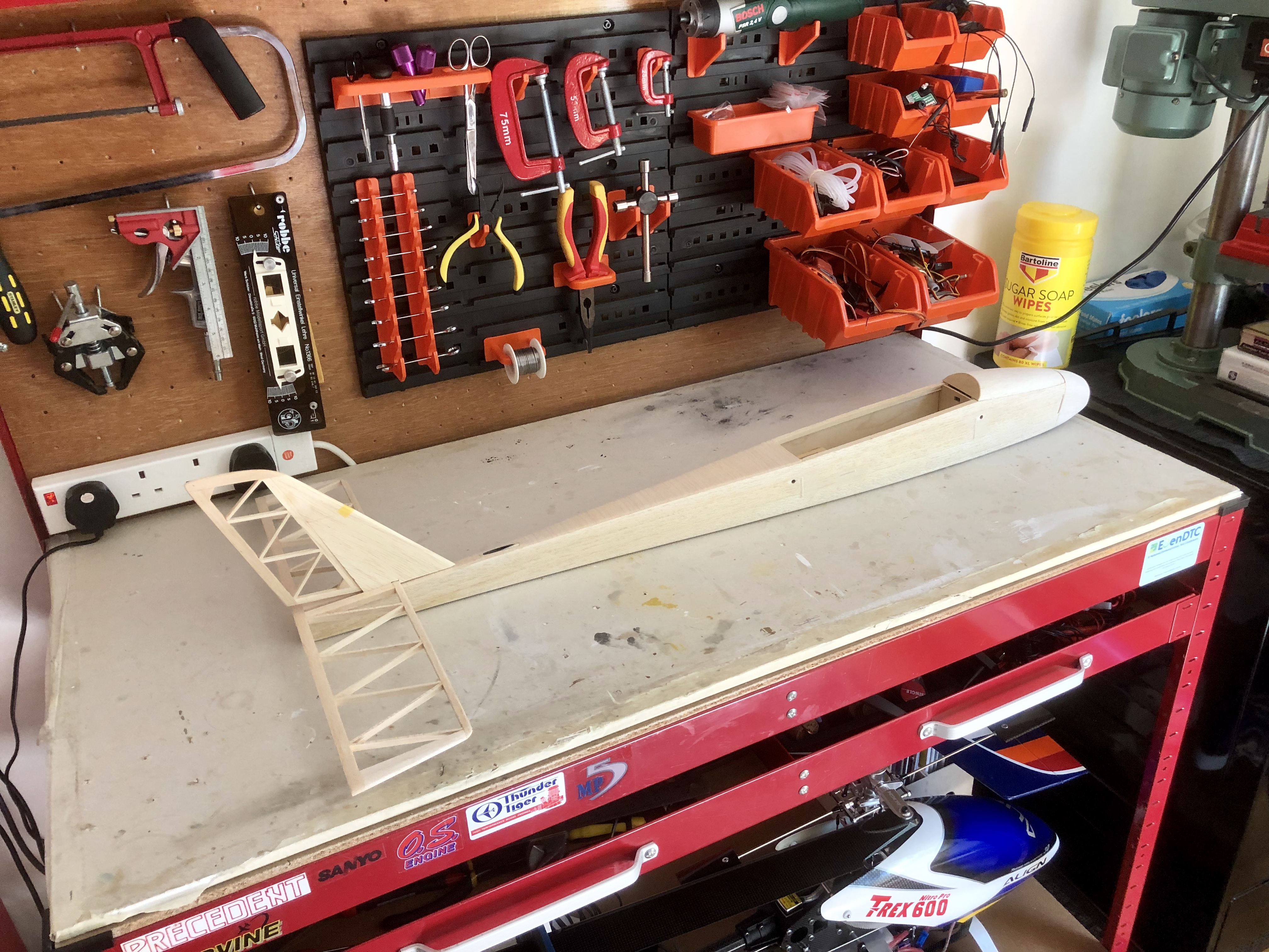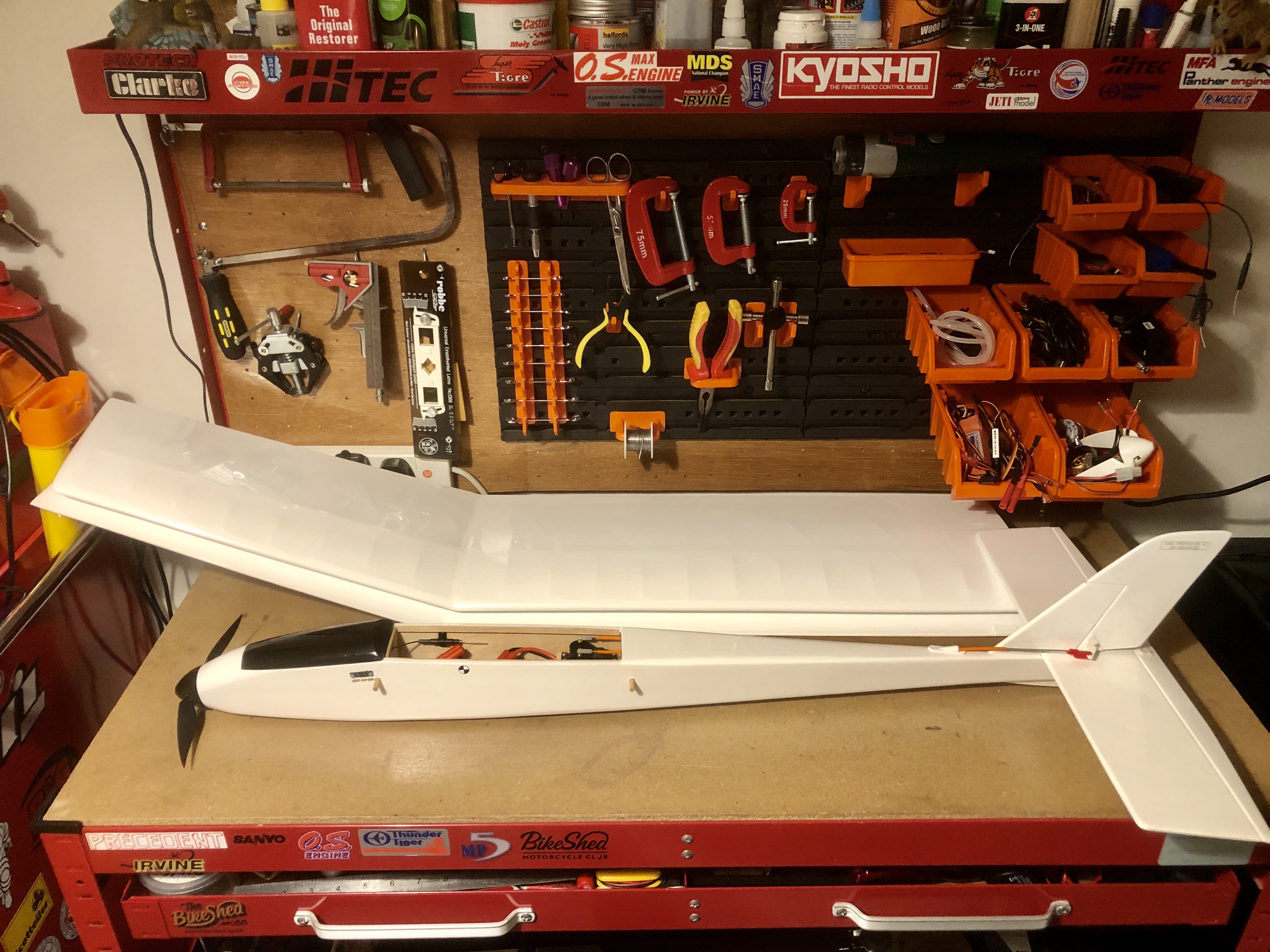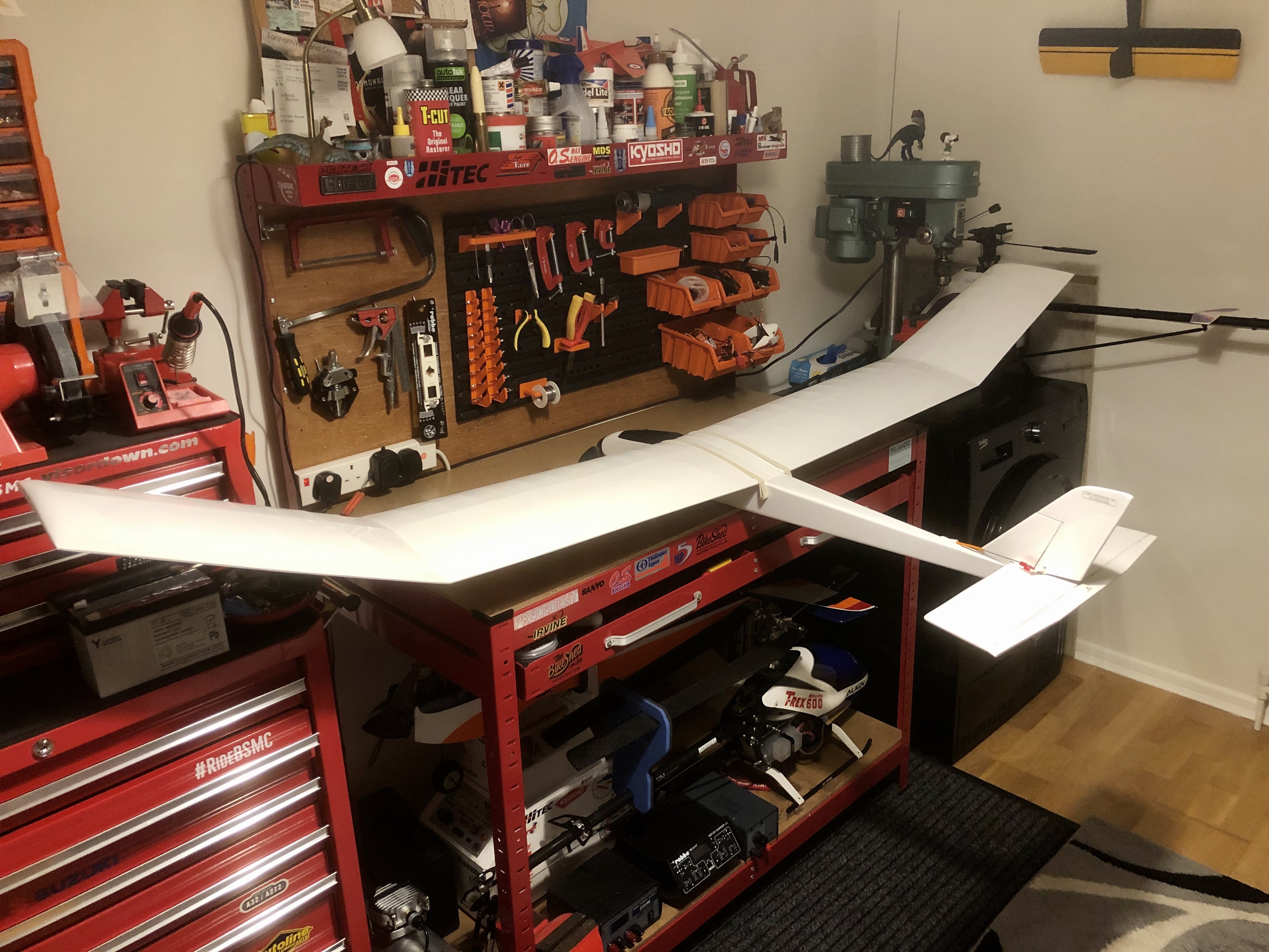 Fully rigged and she only just fits on my bench 😬.The standard 600 takes it aloft adequately but converting to brushless would be straightforward enough as a 3660 inrunner is the same dimension as a brushed 600 can motor. The switch would be more for power efficiency than for any increase in power. This model was designed when electric flight was still novel and folding the wings would be a real possibility if things got too fast. There is no reason why I couldn’t keep a brushless dialled back and just reap the increase in battery duration. Cooling might be an issue with that fully enclosed motor block; especially as all the 3660 brushless motors I can find online seem to be fully sealed units aimed at cars and boats; brushless motors don’t work when wet.