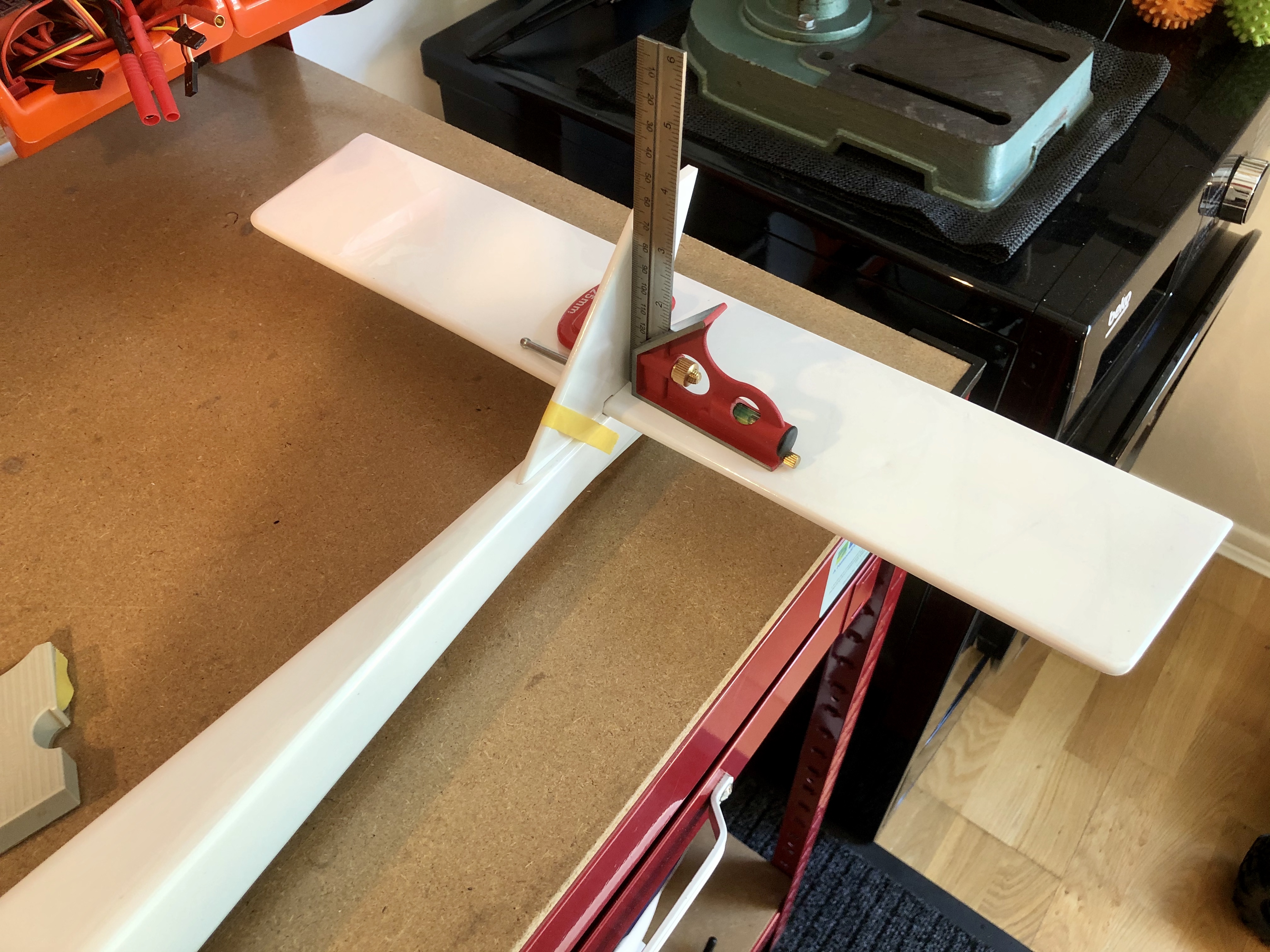 Finished wings. I understand later kits came with a sheeted forward leading edge to stiffen the inboard panels as motors become ever more powerful. Mine didn’t include this upgrade so it must have been an earlier kit. I will just have to keep flights sedate to not overstress the structure.Fully assembled this is a largish model with a wingspan of 2.2m. I opted to reduce the dihedral from the outset to that recommended for those who can already fly. One modification I did make was to glue the metal brace rod into one wing to eliminate any chance of it rotating in flight and altering the dihedral. Something that I uncovered after a search of old forums be an issue with this model due to the way the wing can, if going too fast, ride up at the front over the canopy seating.