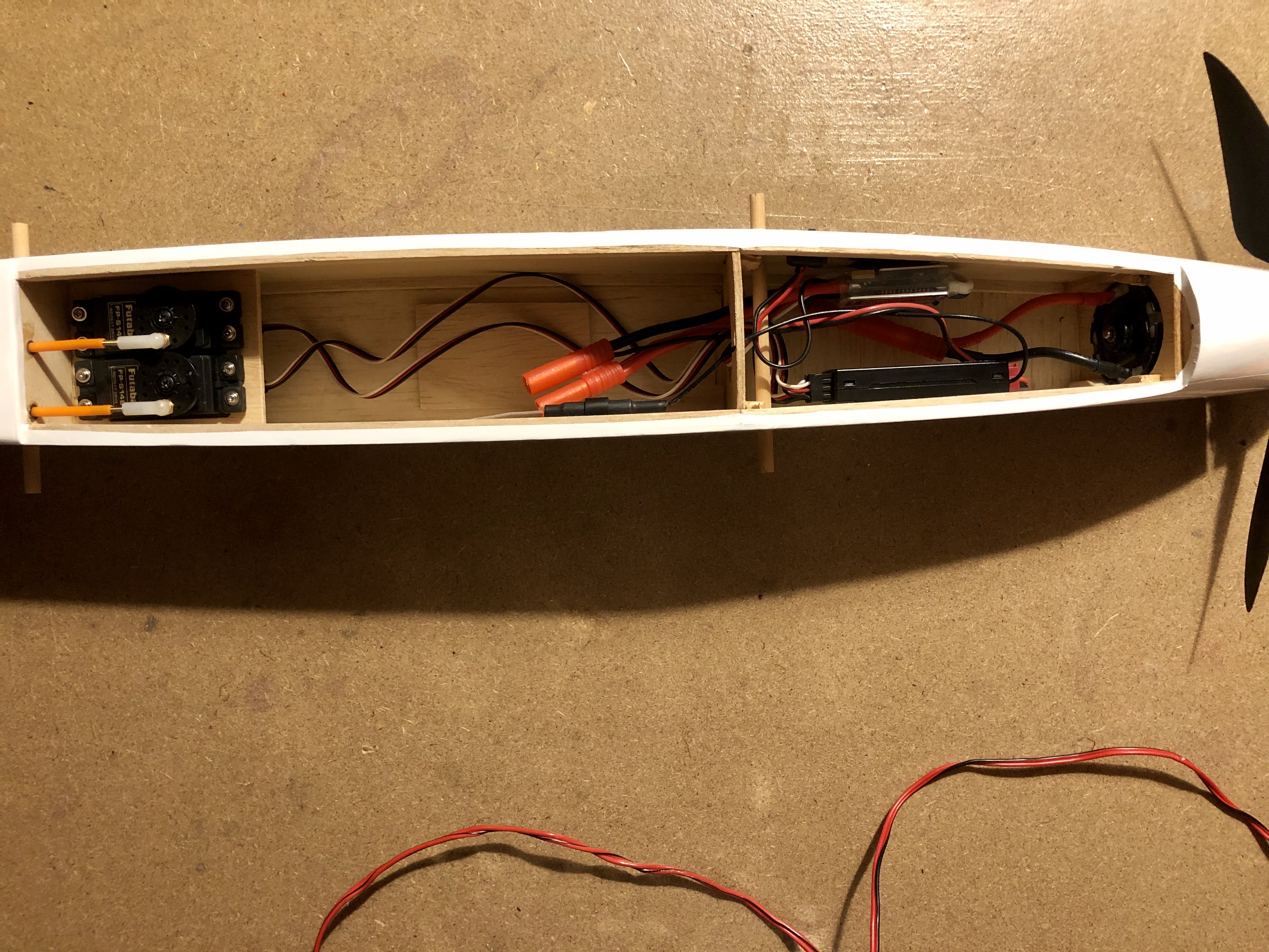 Plenty of room. When first marketed, the Electra Fly’s front compartment would have been filled with a separate receiver battery, and the (then much larger) receiver would have been squeezed in on top of the flight pack in the aft section. There was also an option to use the elevator servo to actuate a rudimentary motor control switch. Full down elevator to turned things off and full up to switch back the motor back on. I can only image the terror this must have induced!