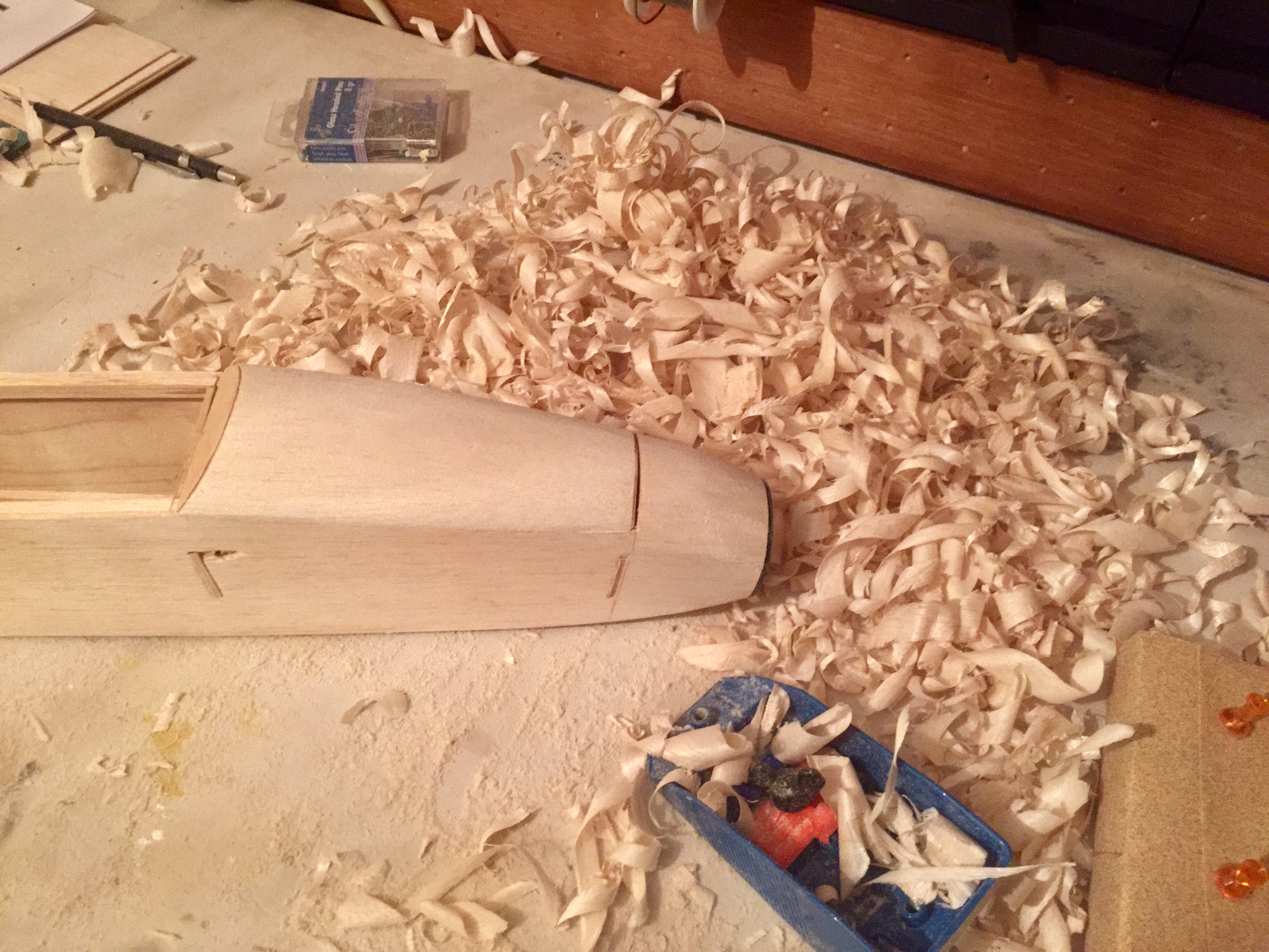 The nose sections consist of solid balsa blocks that need to be carved to shape – been a whole since I’ve used a wood plainer on a kit. Soon had a nice pile of wood shavings built up complete with a sense of satisfaction at a job well done 😊