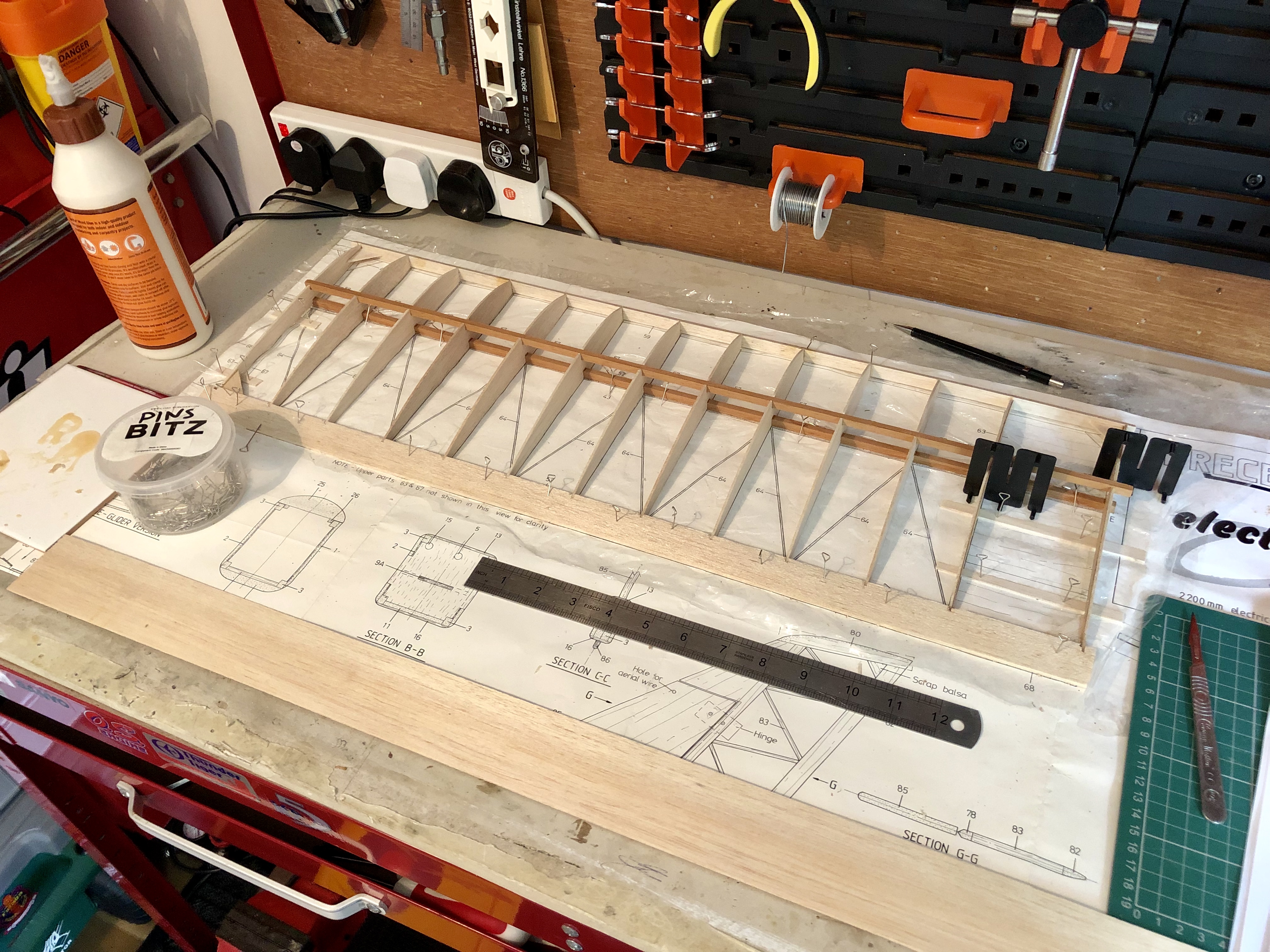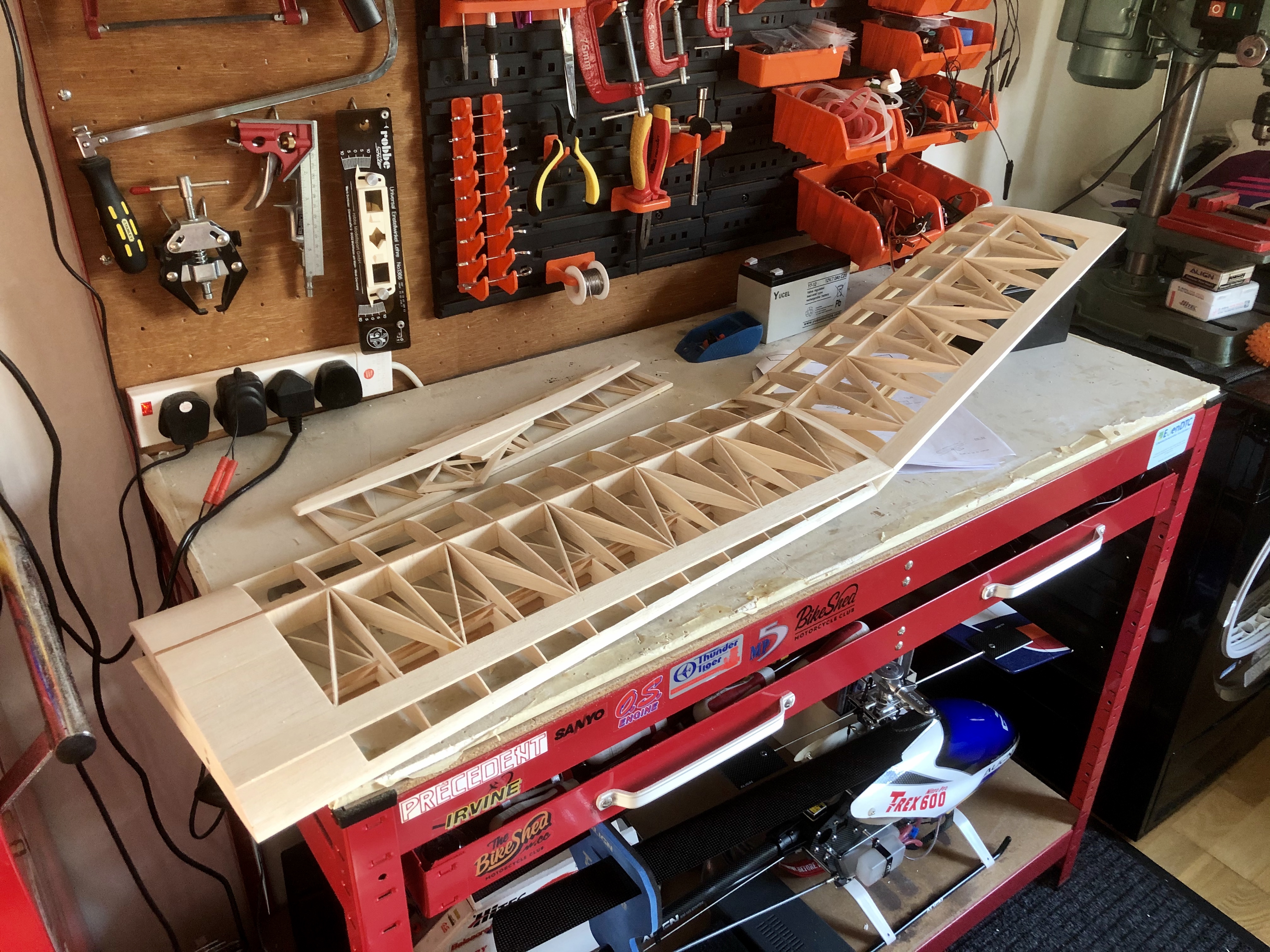 Once the spars were strighted out, the wings went togther smoothly. There is a lot of wing area to build and things are kept interesting with those novel diagonal rear ribs.