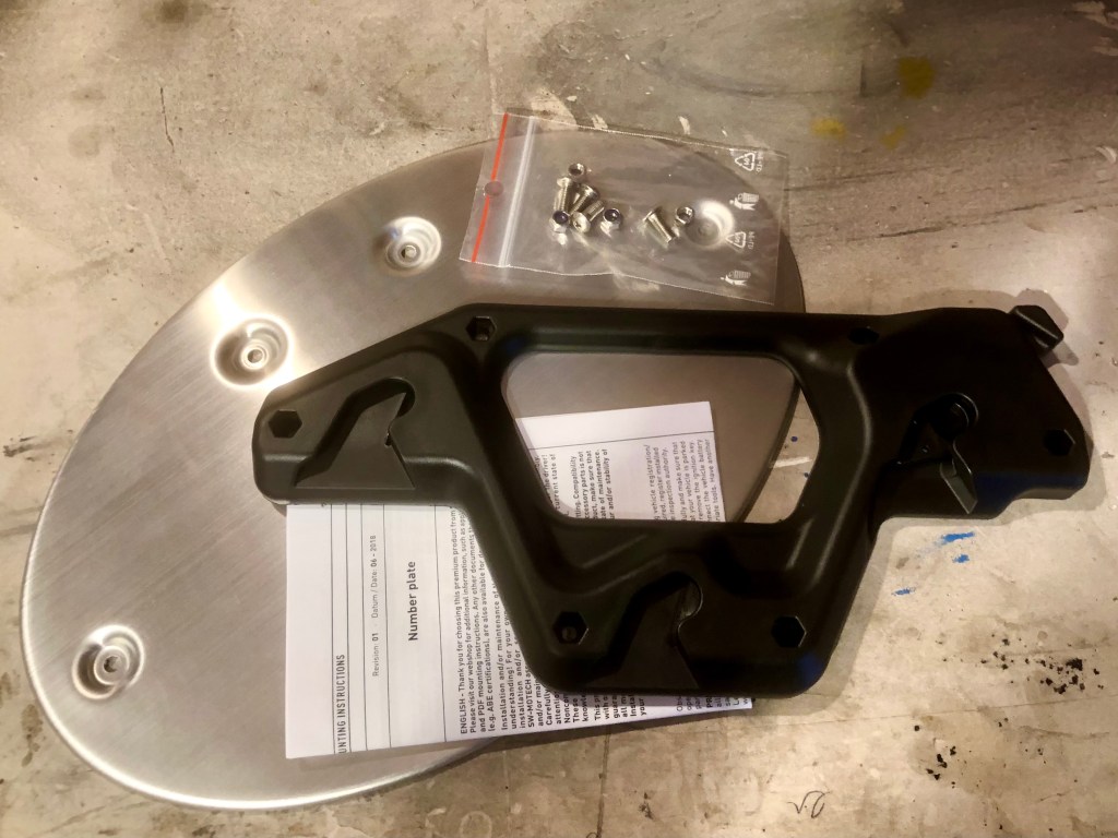 Which has left me wondering what to do with my now redundant (but expensive!) leather panniers looking down at me forlornly from the shelf…. After a bit of research, I found out that SW-Motech sell a conversion set allowing just about any bag (or even object) to be attached to their SLC system. These kits come in a variety of sizes and all come with lots of additional hardware including a back plate to give added support/shape. My leather panniers already have a back plate making the rest of the kit redudant and an expensive way to get just the SLC bracket. A quick email to SW-Motech confirmed they don’t sell the bracket on its own. What they do sell is a Café-racer style number plate for approx. half the price of the conversion kits and complete with that coverted bracket 😉.