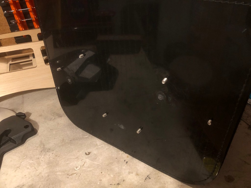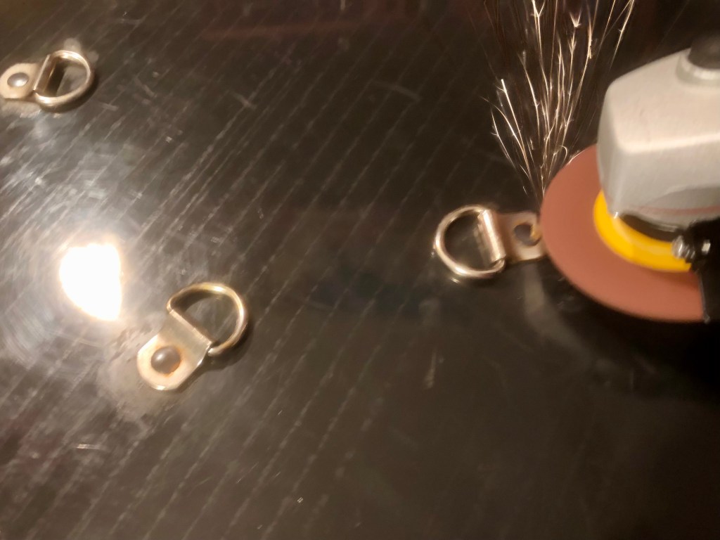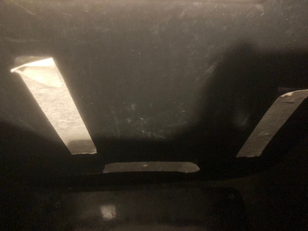 Turning to the metal securing loops. These are rivetted in place so require grinding to remove. The back plate is plastic so work quickly to avoid things getting sticky and leaving a ragged hole. I applied masking tape to the inside to plug off the holes and filled with automotive epoxy. A good trick is to zap the glue in the microwave for several seconds to make it runny allowing it to flow nicely into the holes. This does significantly reduce the setting time so work quickly!