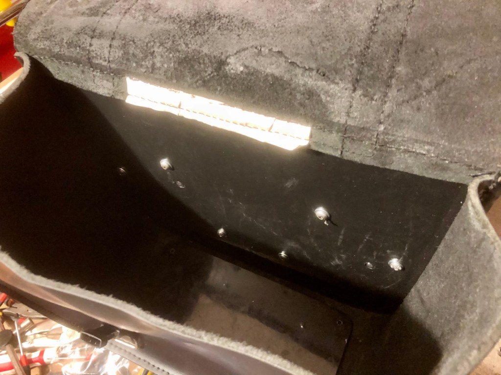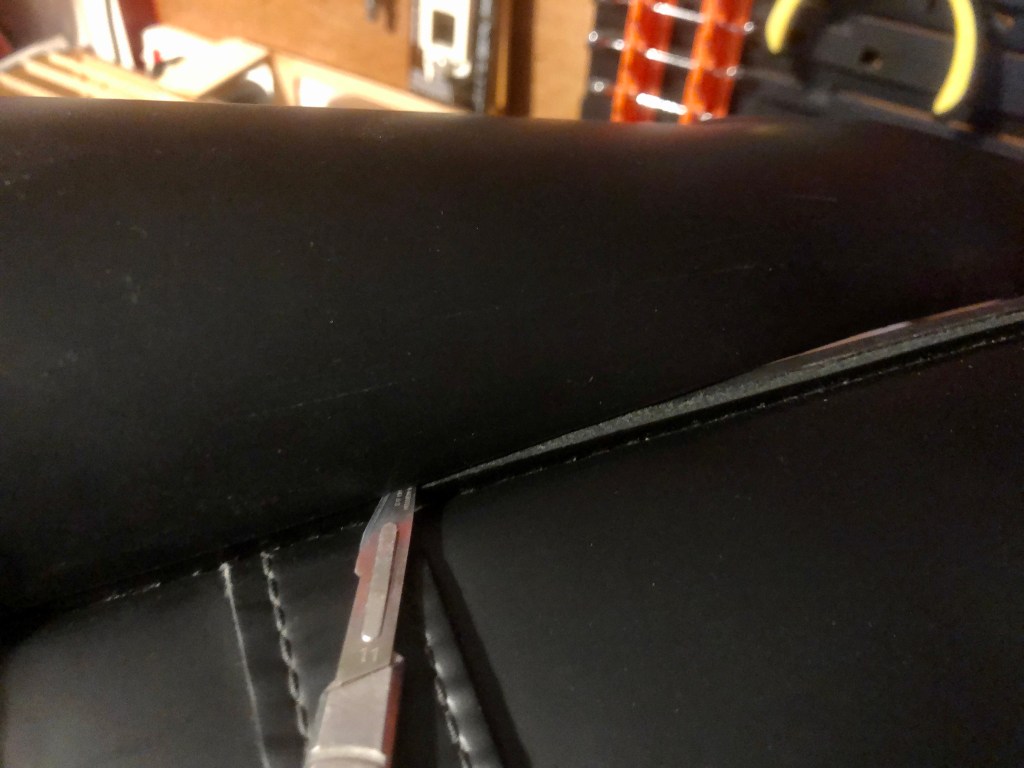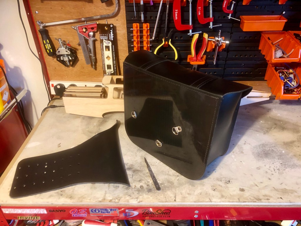 First step was to slice off the throw-over flap. Cutting leather, even heavy grade like these panniers is simply down to using a very sharp blade. Snap in a new scalpel and you will find the blade slices through as smoothly as butter. I used the straight edge afforded by the back plate to draw the blade along to leave a smooth edge that is all but invisible.