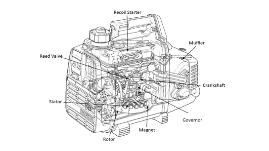 To keep the EX350 light, Honda used a 35 cc 2-stroke with everything running through a unique crankshaft design on a single axis. The pull starter mechanism was integral to the top crankcase and the stator doubled up as the flywheel. The little EX series were the only 2-stroke generators Honda ever produced and, as this type of engine just cannot meet modern emission laws, are likely to remain as unique examples. While most mains devices and power tools from several decades ago were rated at less than 300 Watts, they are considerably higher now and beyond the ability of the EX350. Even if the rated wattage is low enough, they likely require the high energy peak of the sine wave which is absent on a modified-square wave. Finally, for short length excursions, lithium power packs have made the need to run portable devices from an internal combustion generator a thing of the past. Still, the high level of engineering inside is fascinating and for that reason alone I have one myself (oh and it’s red; my favourite colour!).