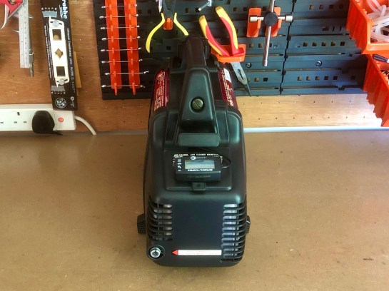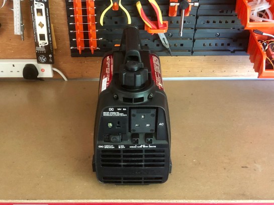 While some modern mains powered battery chargers might stuggle with the quasi-sine wave, the EX350’s own 12v DC output is perfectly capable of charging a car/caravan battery on it’s own. It is rated at 6 amps and is ideal for top-ups. It’s not a float charging circuit and the generator will essentialy strive to put out a flat 6 amps at all times. Overcharging won’t be appreciated by the battery so you will need a multimeter or similar to monitor the batteries level of charge. Here my EX350 is putting out just shy of 4.5 amps into this car battery. It’s an old battery (hence why it’s no longer in my car) and likely has an elevated internal resistance so I cannot blame the little generator from stuggling.