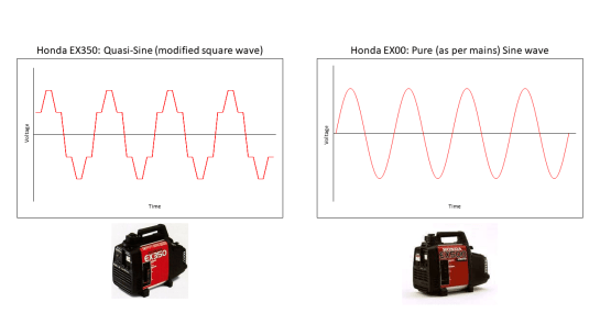 The EX350 outputs a Quasi Sine wave (sometimes called a modified square wave). A pure Sine wave first appeared with the later EX500 and then on all subsequent Honda generators. While the quasi wave of the little EX350 was a compromise, it was stable and a significant improvement on previous generations.