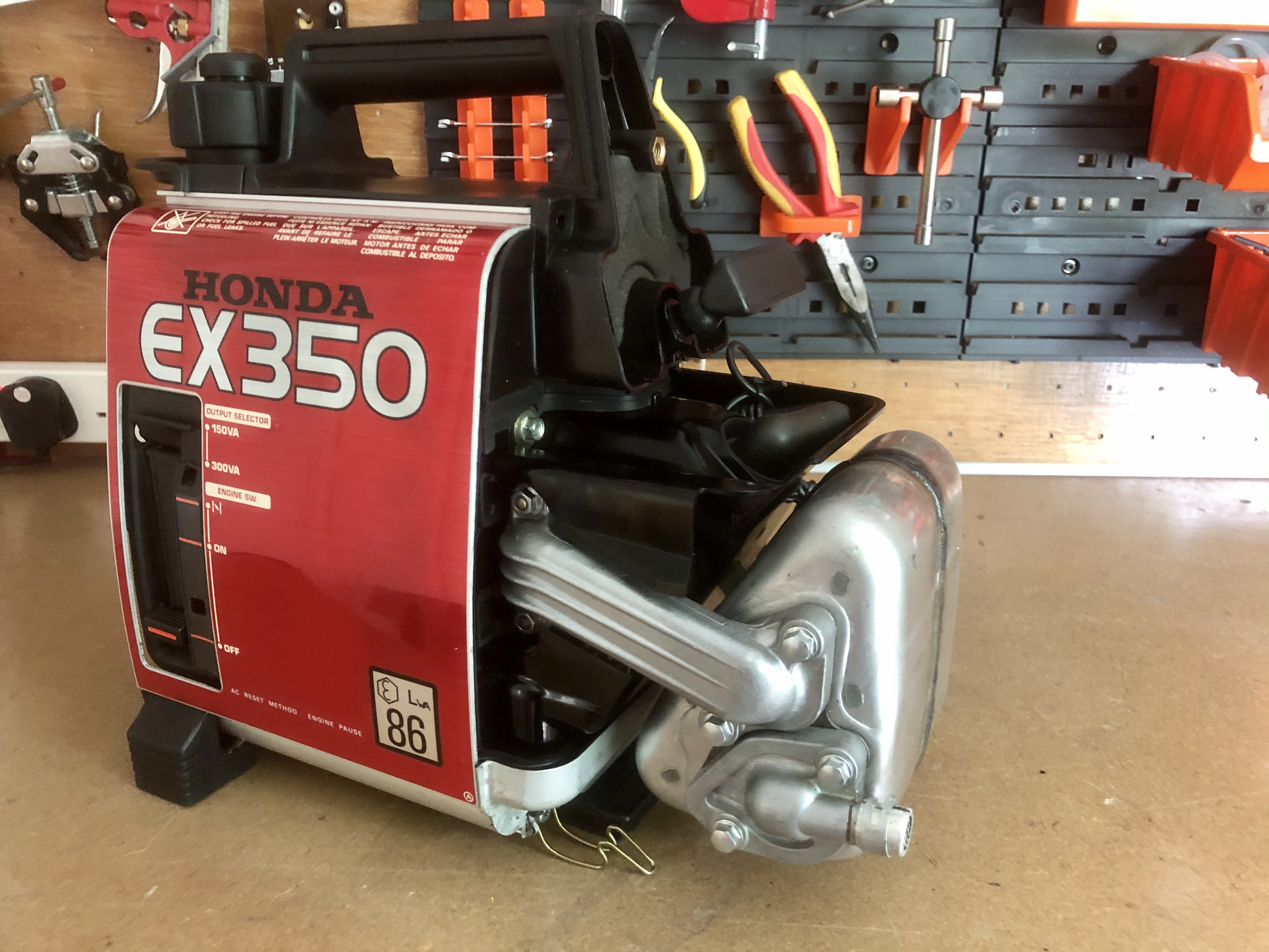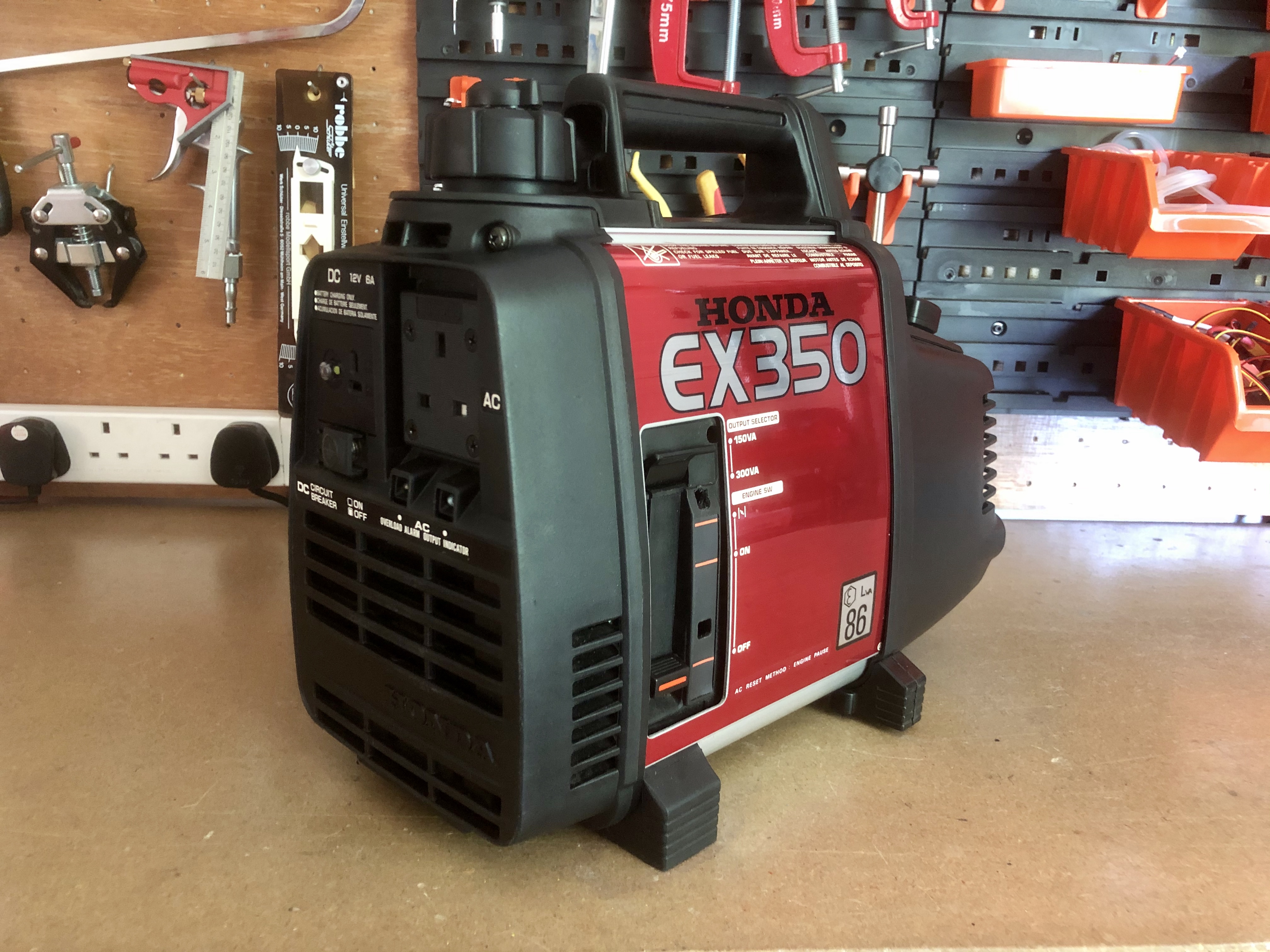 The diminutive yet indomitable Honda EX350 portable generator was introduced in 1987 and was the second-generation domestic generator from Honda. Notably it was the world’s first to introduce an inverter circuit. This was achieved though some wonderful engine miniaturisation to turn a three-phase multi-pole (15 poles AC and 6 poles DC) high-speed stator which, via an intermediate DC regulator/rectifier was then reconverted back to mains voltage AC current through a simple invertor. All standard stuff these days but novel at the time. The sine wave was a simple 50 Hz modified-square, but the important point was that it was stable.