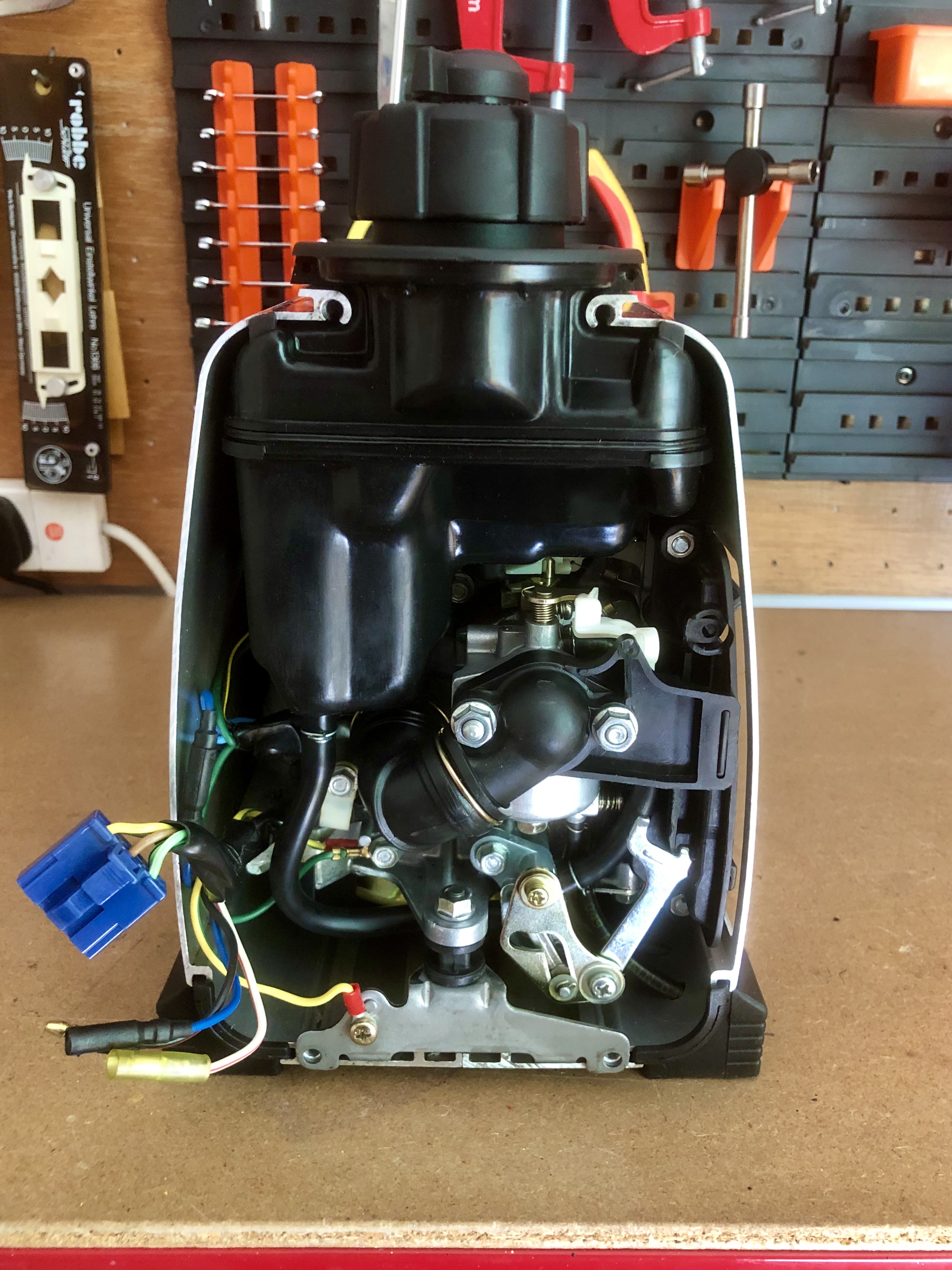 Ive added a small LCD hour counter (tacho) and RPM monitor at the rear. This has an input cable that is wrapped several times around the spark plug HT lead to count the ignition pulses. Takes the guess work out of setting the engine’s rpm follow a carburettor rebuild.