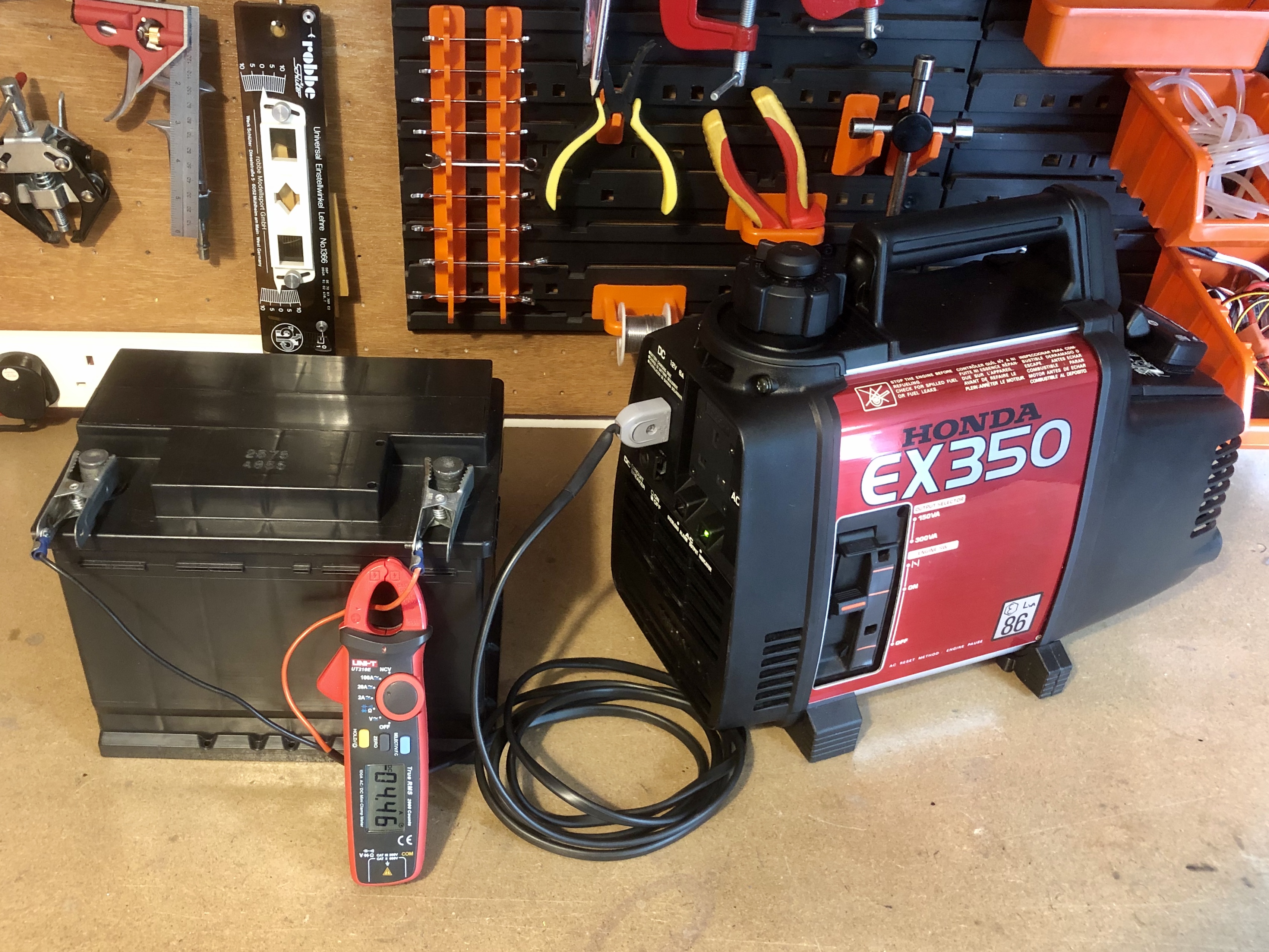 While some modern mains powered battery chargers might stuggle with the quasi-sine wave, the EX350’s own 12v DC output is perfectly capable of charging a car/caravan battery on it’s own. It is rated at 6 amps and is ideal for top-ups. It’s not a float charging circuit and the generator will essentialy strive to put out a flat 6 amps at all times. Overcharging won’t be appreciated by the battery so you will need a multimeter or similar to monitor the batteries level of charge. Here my EX350 is putting out just shy of 4.5 amps into this car battery. It’s an old battery (hence why it’s no longer in my car) and likely has an elevated internal resistance so I cannot blame the little generator from stuggling.