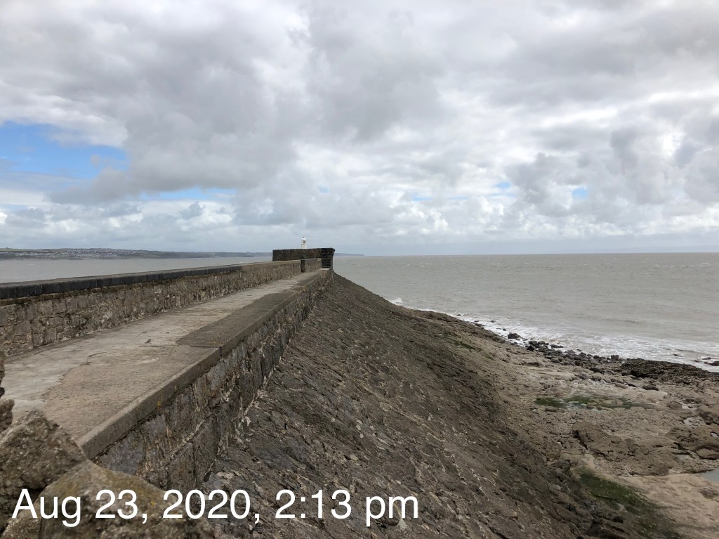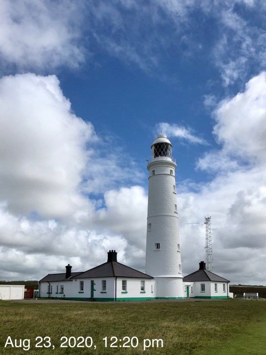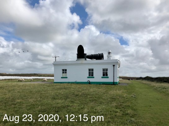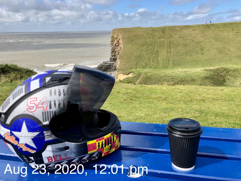 Staying along the coastal B road (B4265) I next rode to Nash Point. Turing off the already narrow B-roads, the single track lane through Marcross seemed to me to be that kind of road that ends up as a muddy farmyard. It actually ends at a lovely clifftop site complete with parking, coffee shop and a spectacular footpath that takes you to the two lighthouses, the visitor experience (sadly closed) and the unique compressed air fog horns. The benches outside the cliff top cafe had a great view from which to enjoy a coffee. I did also have a bacon sandwich and almost lost it in the strong breeze while trying to take a photo. I caught the roll but missed the bag; this was grabbed by a dog being walked behind me. I’m sure it was not impressed when it found out the bag was empty!